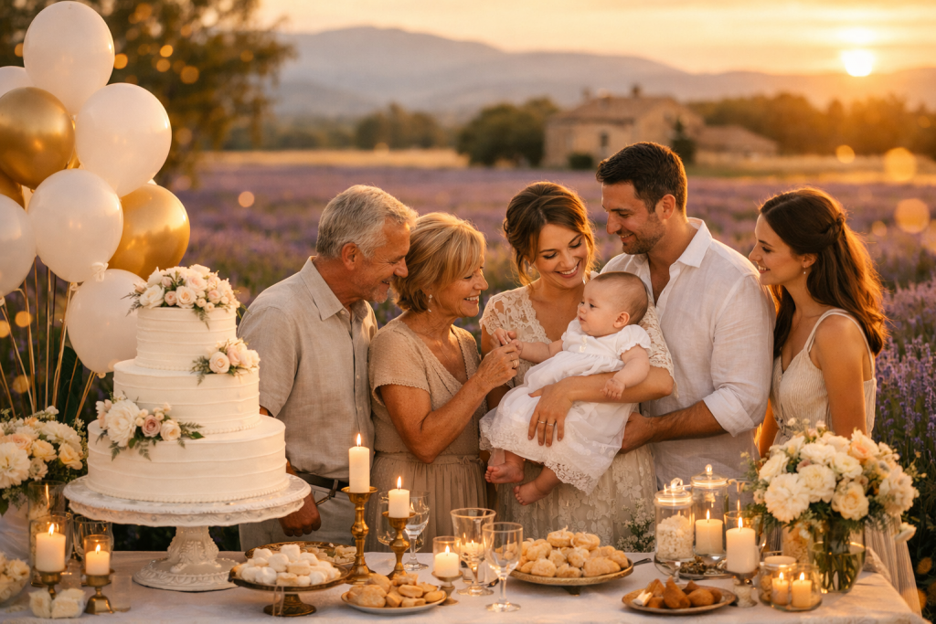 Que vous receviez 20 invités intimistes ou plus de 100 convives, chaque animation baptême en PACA est adaptée à votre lieu, à votre thème et à votre budget — sans démarche administrative complexe pour vous.